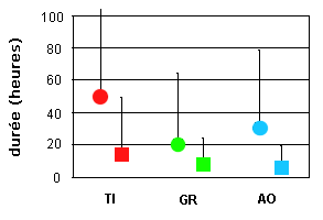 Figure 5 - Répartition des incendies de forêt répertoriés au semestre d’été (mai-octobre) en fonction de leur durée, au Tessin, aux Grisons et en vallée d’Aoste (période 1980-2003). Cercles: incendies de foudre; carrés: incendies d’origine humaine, barres: écart type