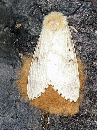 Pendant les 6 à 12 semaines que dure leur développement, chaque chenille mange environ un mètre carré de feuillage. Après la nymphose, les papillons émergent entre juillet et fin septembre. Tandis que les femelles blanches peuvent à peine voler, les mâles de couleur brune, actifs le jour, volent sans répit en zigzags. Après l’accouplement, la femelle dépose des centaines d’œufs à un seul endroit et elle les entoure de ses poils abdominaux jaunâtres.