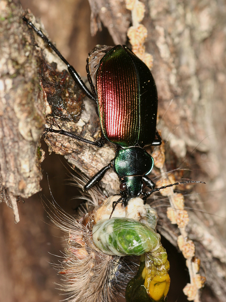 Fig. 8. Un calosome sycophante (Calosoma sycophanta) se nourrissant d’une chenille. Photo: Beat Wermelinger
