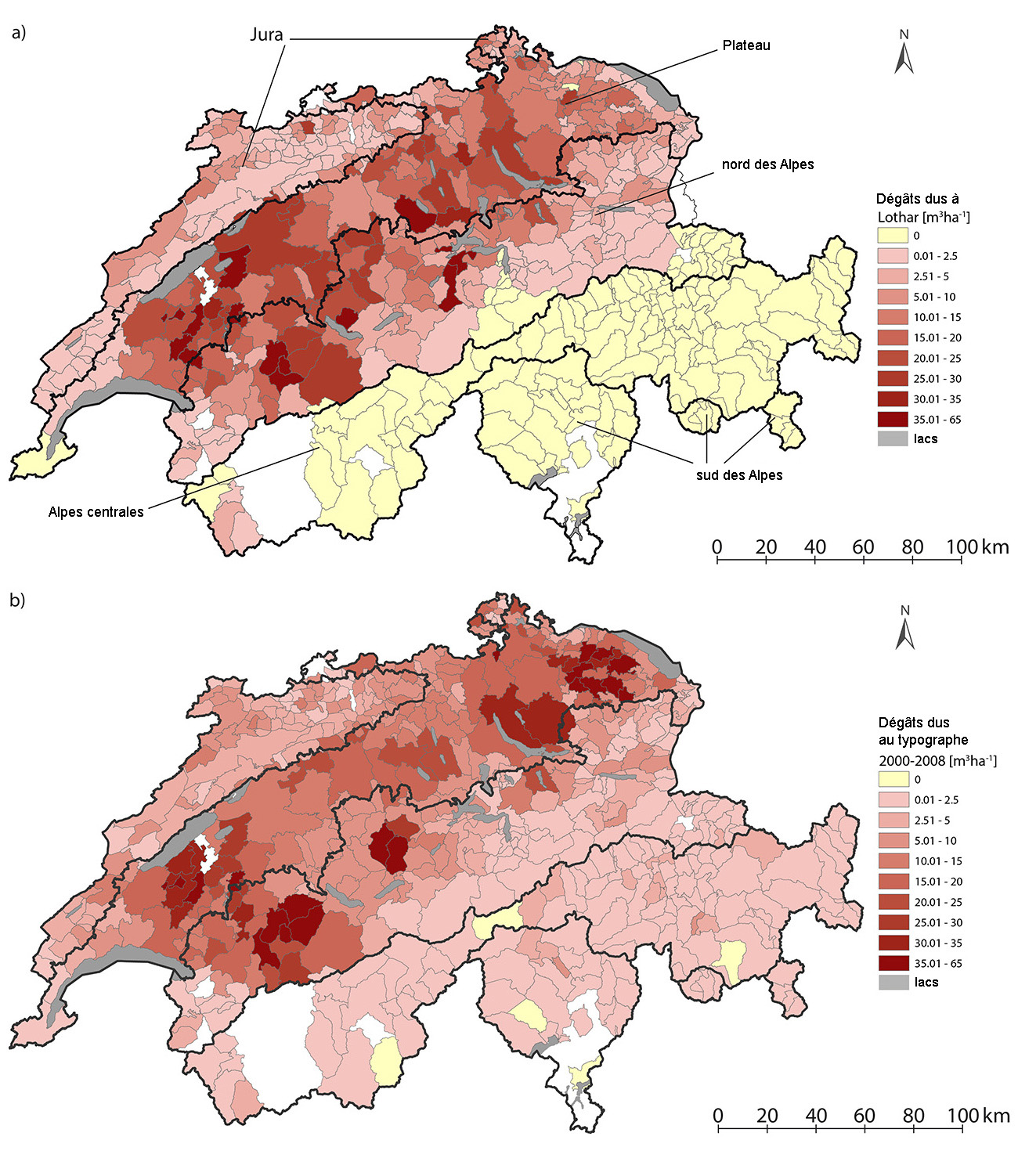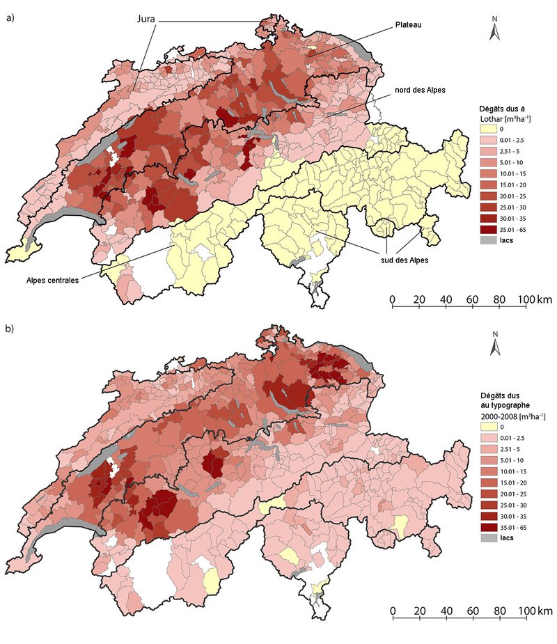 Figure 2 - Rapport entre les dégâts des tempêtes et les infestations du typographe, répartis en 487 unités de protection des forêts (contours en gris). a) Dégâts causés aux épicéas par la tempête Lothar (1999), en mètres cubes par hectare de forêt. Les surfaces en blanc indiquent une série de données incomplète. b) Dégâts dus au typographe de 2000 à 2008, en mètres cubes par hectare de forêt.