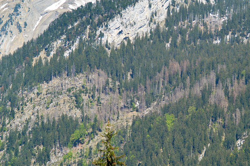 A partir du printemps 2001, les nouvelles attaques aux épicéas sur pied se sont largement multipliées. En conséquence, le façonnage des chablis n’a plus eu d’effet combatif depuis cette époque.