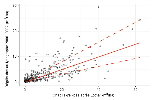 Figure 3 - Rapport entre les dégâts de la tempête Lothar et les infestations du typographe entre 2000 et 2002. Lignes rouges: Prévision et domaine de dispersion (en pointillé) d’une régression quantile.