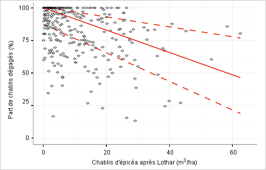 Figure 4 - Rapport entre les dégâts de la tempête Lothar et part de chablis dégagés jusqu’en septembre 2000. Lignes rouges: Prévision et domaine de dispersion (en pointillé) d’une régression quantile.