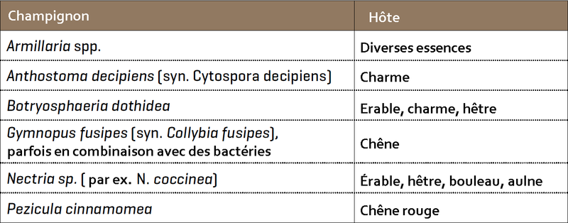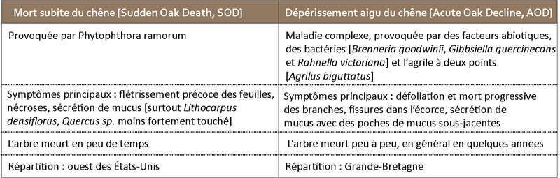 En Suisse, des bactéries Brenneria goodwinii, Gibbsiella quercinecans et Rahnella victorianas ont été observées pour la première fois sur des chênes sessiles au printemps 2017 (en savoir plus). Ces bactéries isolées, décrites initialement en 2008 en Grande-Bretagne, sont liées au dépérissement aigu du chêne (Acute Oak Decline, AOD), à ne pas confondre avec la mort subite du chêne (SOD) (tab. 2).