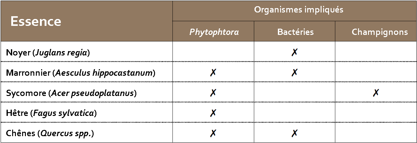 Sur le noyer, la bactérie responsable était Xanthomonas arboricola pv. juglandis. Il est intéressant de noter que les deux espèces de bactéries Brenneria sp. et Erwinia sp. ont également été identifiées. Celles-ci apparaissent parfois aussi sur les chênes affectés par une sécrétion de mucus. On ne sait pas encore s’ils sont présents sur le noyer en tant que colonisateurs secondaires ou s’ils sont à l’origine des sécrétions de mucus. Dans certains cas, des facteurs abiotiques ont également contribué au développement des symptômes, comme chez l’érable sycomore.
