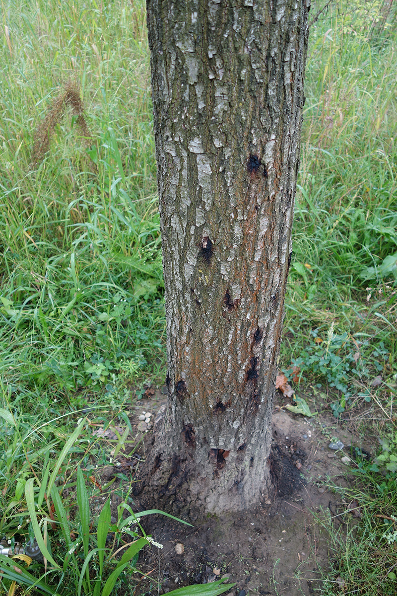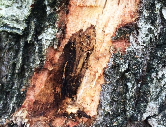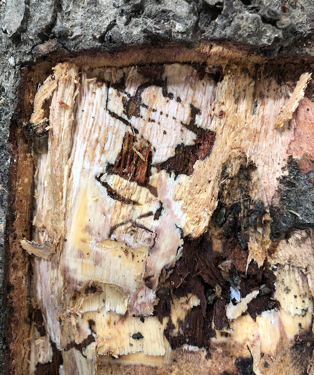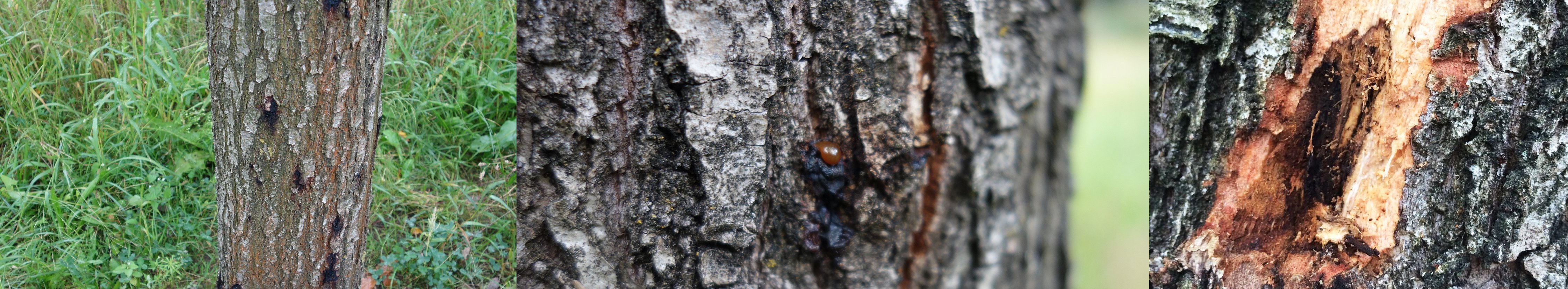 Ces lésions apparaissent typiquement au printemps et en automne. Sous l’écorce, elles se manifestent par des taches humides et foncées (fig. 3) qui se propagent jusqu’à l’aubier. Les chênes atteints dépérissent souvent en quelques années. Il est fréquent que plusieurs chênes de tous âges soient touchés, voire des chênaies entières.