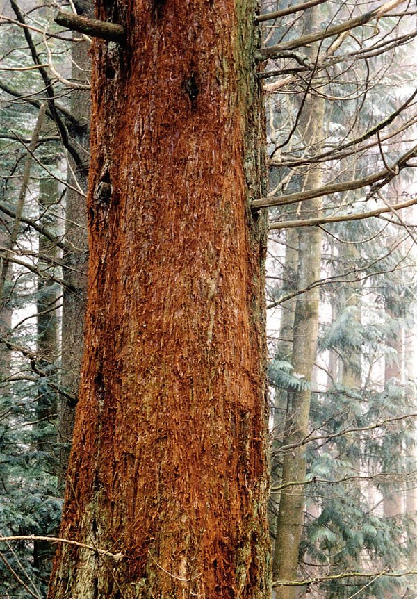 De temps en temps, l’écureuil utilise aussi l’écorce de certains résineux comme matériau de rembourrage, notamment celle qui présente une texture fibreuse. Contrairement à l’écorce des feuillus, celle des résineux est collectée principalement sur des arbres vivants. C’est le séquoia géant (Sequoiadendron giganteum, Fig. 3) qui est concerné en première ligne avec également, d’après des observations personnelles, le cryptomeria du Japon (Cryptomeria japonica), le thuya géant (Thuja plicata), mais aussi le séquoia de Chine (Metasequoia glybtostroboides), ainsi que le cyprès chauve (Taxodium distichum), toutes des essences exotiques. D’après le type d’écorce, les essences concernées sont celles qui présentent une structure naturelle fibreuse ou un rhytidome qui s’exfolie en lanières sur le fût.
