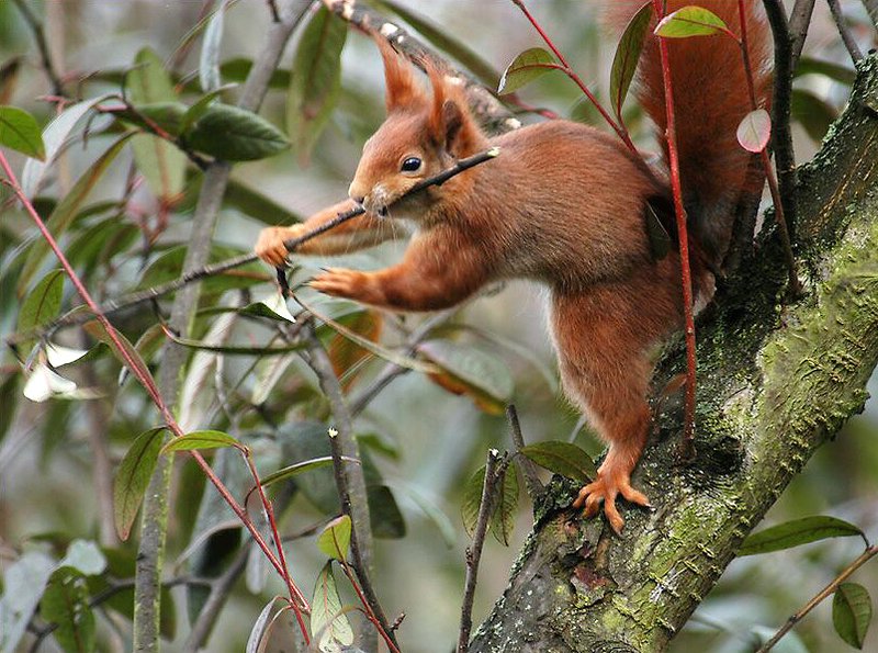 La préférence de l’écureuil pour les fibres de liber, en tant que matériau de construction et de remplissage, est significative, du moins en ce qui concerne la hotte principale ou celle abritant la portée. Ainsi, en 1876, on rapportait déjà que, par opposition aux nids estivaux, «les quelques hottes terminées, dans lesquelles il héberge également sa progéniture, se distinguent par leur taille supérieure, par leur aspect sphérique et par leur rembourrage composé de fibres d’écorce».