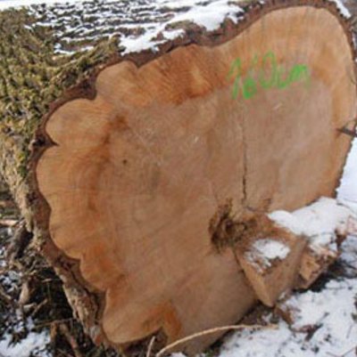 Fig. 1. Tronc de châtaignier abattu. Le bois du châtaignier a une couleur chaude, aux tons brun doré. Contrairement au bois de chêne, ses rayons médullaires ne sont pas visibles à l’œil nu. Photo: Orlando Jäger