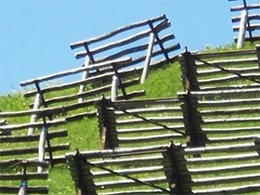 Fig. 3. Ouvrage paravalanche en bois de châtaignier sur une pente raide. Ce bois provient d’une futaie. Photo: Orlando Jäger