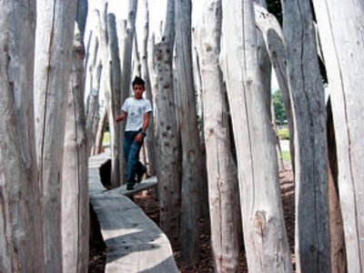 Fig. 1. Des poteaux en châtaignier écorcé ou fraisé servent à fabriquer des jeux durables, ici un labyrinthe. Photo: Fulvio Giudici