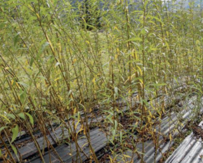 Une autre possibilité est de cultiver des saules sur un terrain ensoleillé avec un apport modéré en nutriments et en eau. Les boutures sont alignées avec une densité similaire à celle d’un champ de maïs. Elles poussent en association et sont donc plus longues, plus droites, plus minces et se ramifient moins. Elles sont coupées hors de la période végétative à ras du sol.