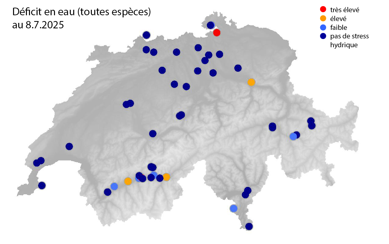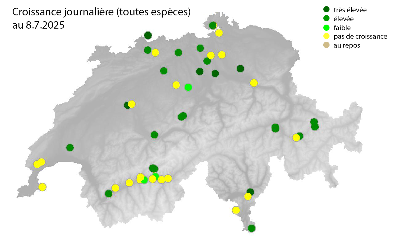 Les analyses cartographiques régionales révèlent en outre de nettes différences dans le stress hydrique moyen à long terme: les charges les plus élevées sont observées en Valais et dans certains sites du nord de la Suisse, les plus faibles sur le Plateau (fig. 6). Pour la croissance, le climat régional n’est pas seul responsable puisque le choix de l’essence en fonction de la station joue aussi un rôle.