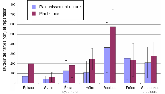 Quinze an après "Vivian", les tailles des jeunes arbres étaient très différentes, non seulement d’une essence à l’autre mais également au sein d’une même essence (figure 4). Avec une hauteur moyenne de 4 à 6 m, les bouleaux étaient de loin les plus grands tandis que les sapins étaient les plus petits avec environ 50 cm de hauteur. Les arbres plantés étaient presque tous plus grands que ceux du rajeunissement naturel. L’avance la plus spectaculaire était celle des épicéas, des hêtres et des bouleaux plantés. C’est un élément important en forêt de protection, car les arbres de petite taille n’offrent pas de rempart fiable contre les départs d’avalanches et les chutes de pierre.