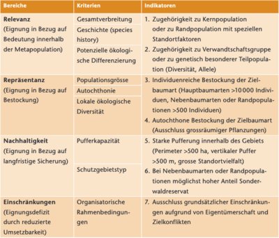 Tab. 2 Thèmes, critères et indicateurs de l’adéquation des réserves forestières comme aires de conservation génétique (en allemand).