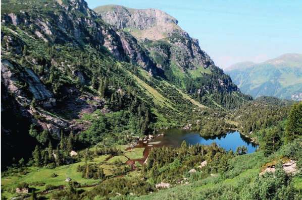 Fig. 1 - La haute vallée de la Murg (SG ; photo) et le Mürtschental (GL) englobent à elles deux la plus grande population relique d’aroles (Pinus cembra) sur le versant nord des Alpes avec plus de 20 000 individus.