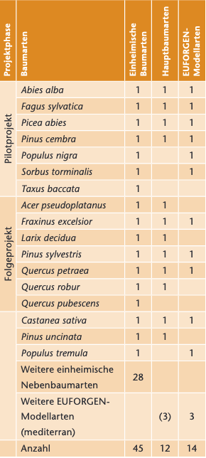 En Suisse, 45 essences sont considérées comme autochtones, et 7 d’entre elles ont été choisies pour un projet pilote. Ce choix découle principalement de l’importance pour la Suisse (par exemple essences principales) et des principes paneuropéens (essences modèles EUFORGEN). Les populations des essences principales sont relativement bien connues grâce aux données de l’Inventaire forestier national (IFN). Malheureusement, c’est moins vrai pour les essences accessoires, et des inventaires complémentaires sont nécessaires. Parmi les essences choisies, il existe parfois des données génétiques qui, combinées avec des analyses paléoécologiques classiques (pollen, macrorestes) donnent des indications sur la structure génétique et les chemins migratoires des sous-populations.