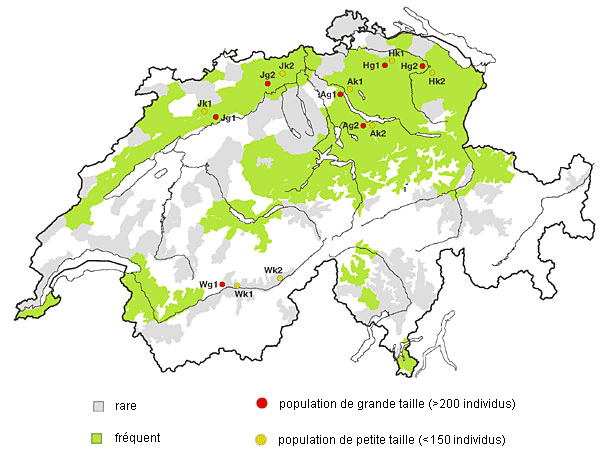 Tableau 1 - Localité, taille des populations et sex-ratio des 15 populations d’ifs étudiées en Suisse et des peuplements d’ifs évoqués dans l’encadré 2 (NSK). La population Waldjini Talwald ne comptant que quatre individus adéquats, elle n’a pas été soumise à une analyse de génétique moléculaire ni à la détermination du sex-ratio. G = population de grande taille (plus de 200 individus) et P = population de petite taille (moins de 150 individus)
