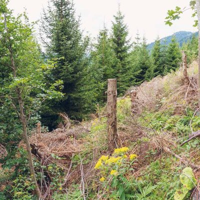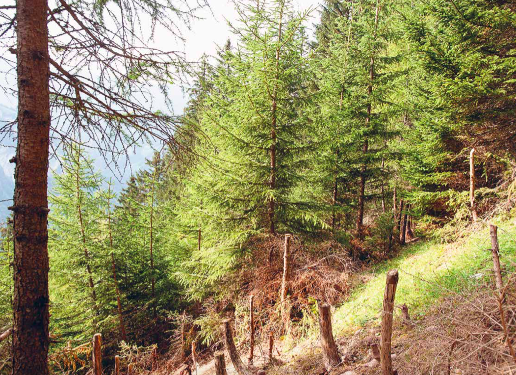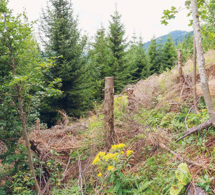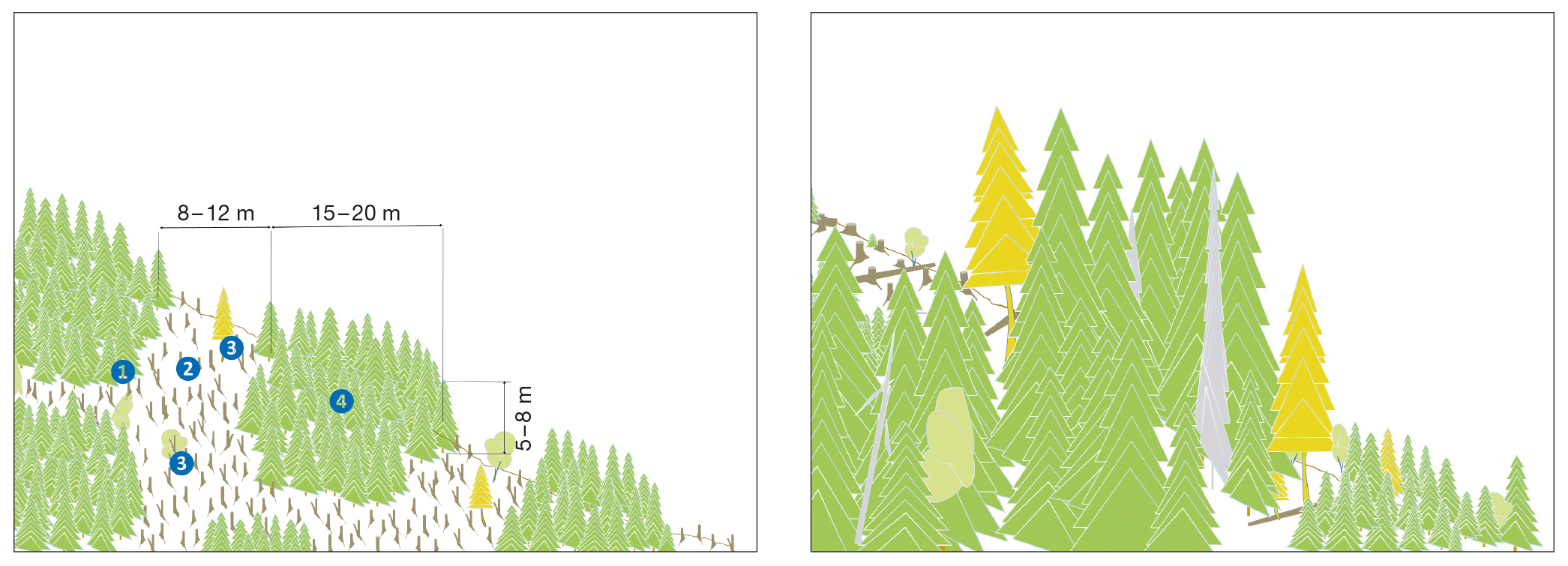 Tous les épicéas sont systématiquement éliminés des couloirs (fig. 6, n° 2, mais d’autres essences conservées (mélèze, arole, pin, sapin, sorbier des oiseleurs et autres feuillus) (fig. 6, n° 3). Les souches hautes (fig. 6, n° 2) protègent contre les mouvements de la neige (et les chutes de pierres) – le cas échéant, il faut éliminer les branches vertes de ces souches pour éviter qu’elles ne se redressent et ne forment une nouvelle couronne.