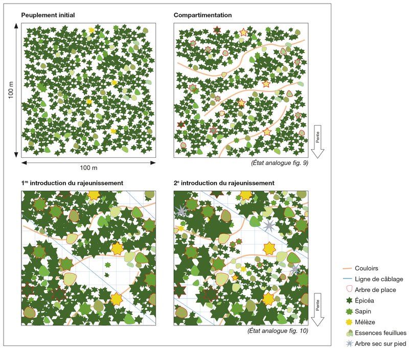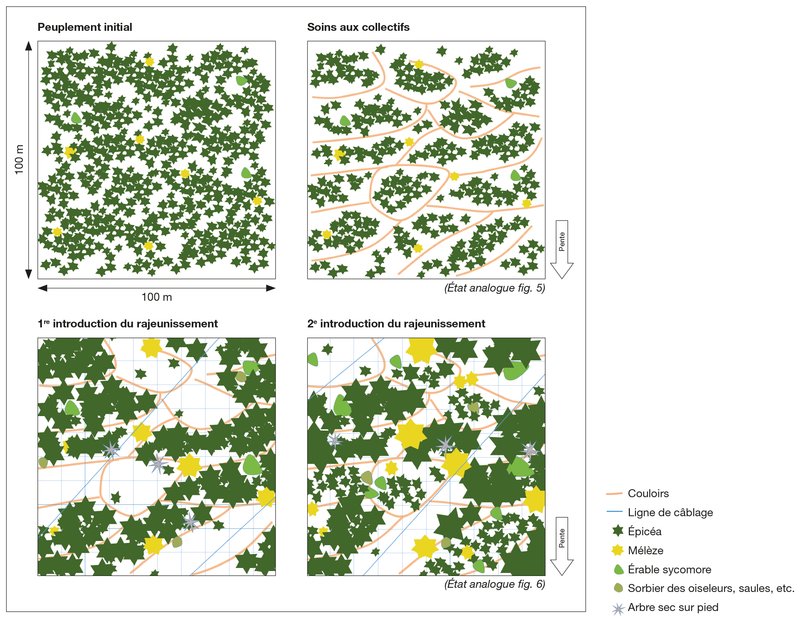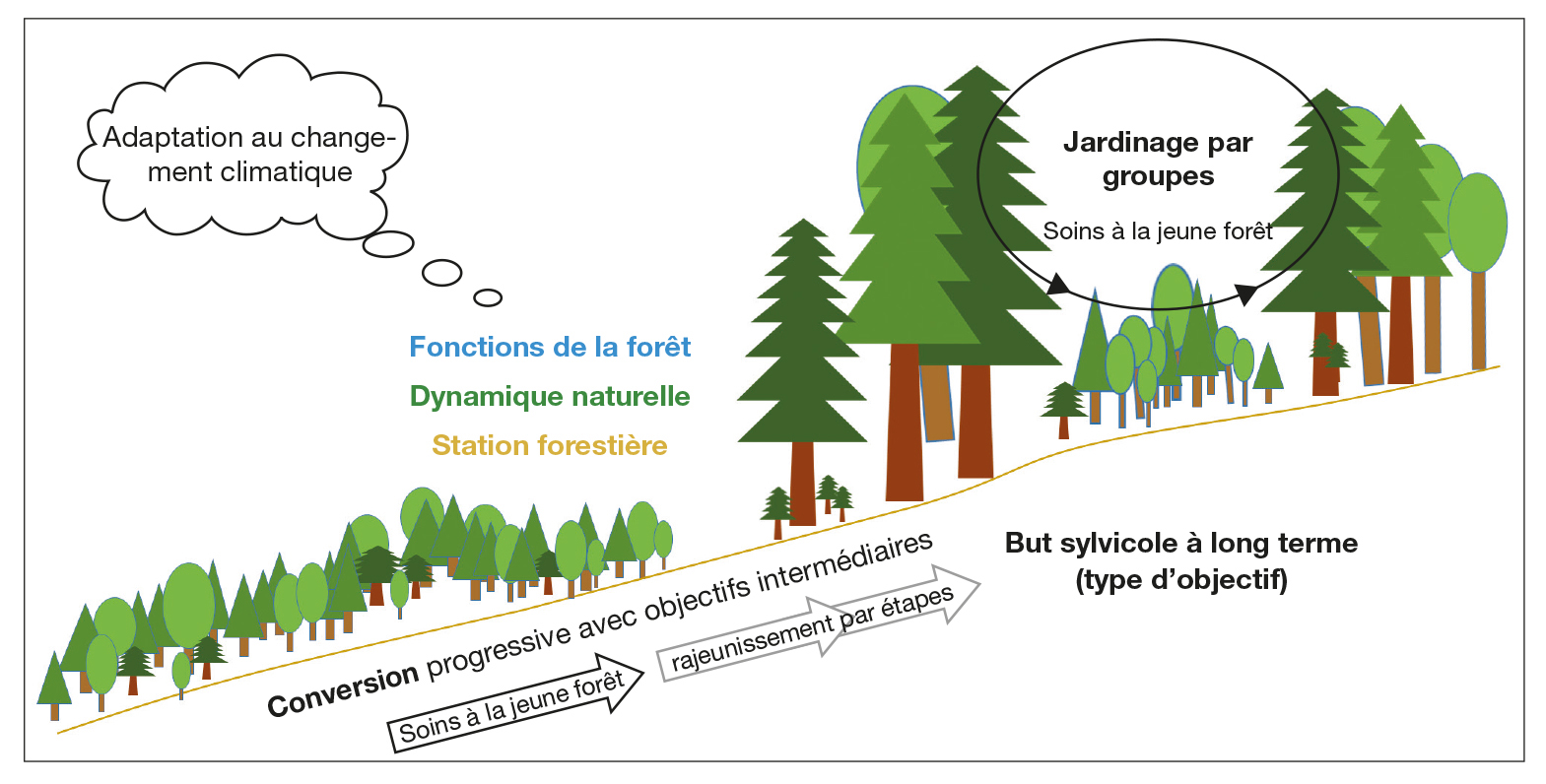 Les soins à la jeune forêt font partie d’un tout. Il est essentiel de considérer les soins à la jeune forêt comme partie intégrante de la gestion des forêts et de les diriger dès le début vers l’objectif sylvicole à long terme. En forêt protectrice, les mesures découlent de l’analyse du besoin d’intervention (NaiS). Les méthodes présentées dans ce document sont à comprendre comme des interventions initiales, permettant la conversion de jeunes peuplements surfaciques en forêt jardinée par groupes. Ces forêts présenteront plus tard les conditions requises pour un rajeunissement échelonné menant à des structures étagées. Par la suite, le rajeunissement dans les peuplements jardinés a lieu sur des surfaces de plus en plus petites et ne demande souvent que des interventions ponctuelles au profit de certains arbres ou de (petits) collectifs.