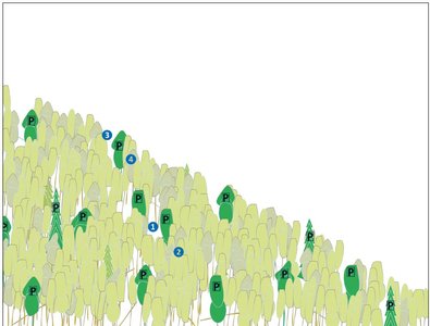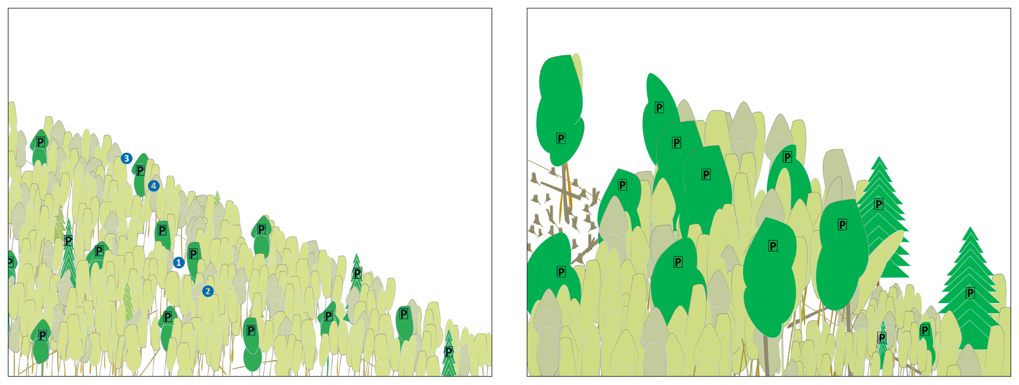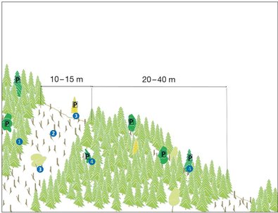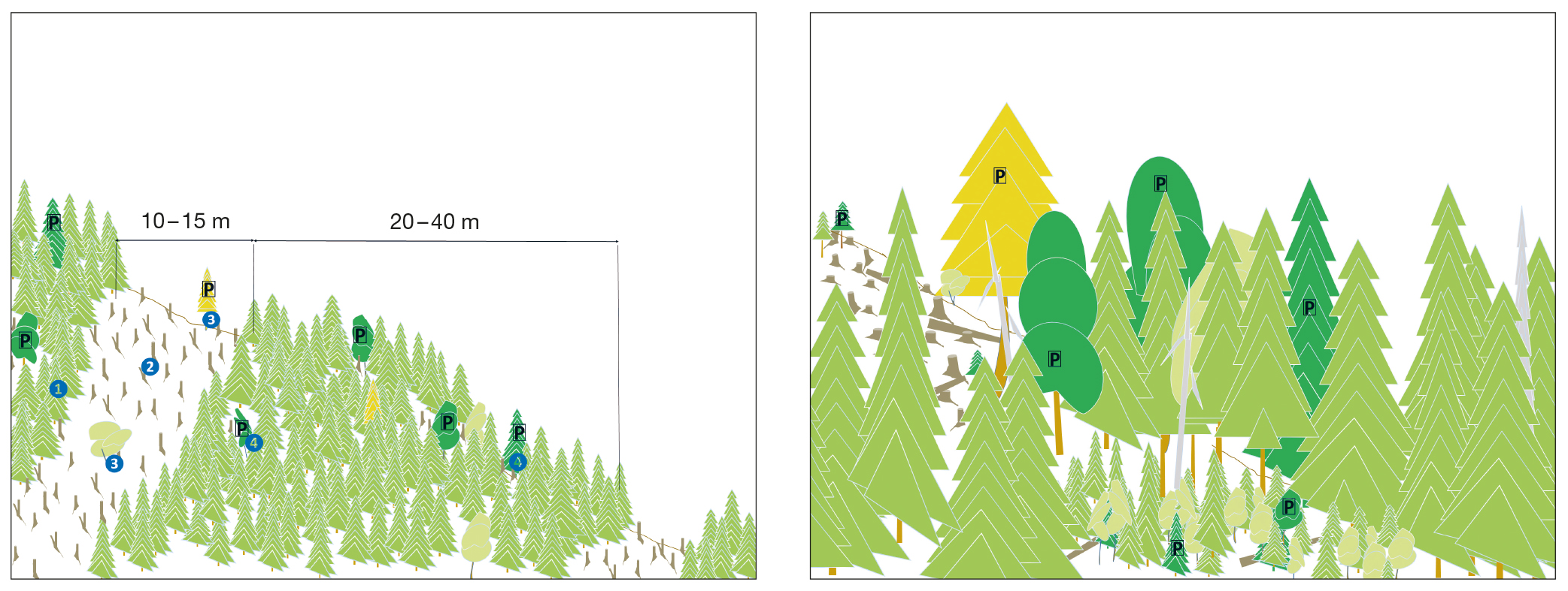 Les arbres de place (individus ou petits collectifs) sont choisis à l’écartement définitif et favorisés. L’écartement doit être suffisamment grand. L’intervention se fait pour les arbres de place (fig 14, n°1). Aucune intervention n’est menée entre eux, afin d’éviter les mêmes effets négatifs que ceux engendrés par la désignation d’un nombre d’arbres de place trop élevé. (Fig. 14, n°2). L’intensité des interventions varie en fonction de la vitalité, de l’essence, de la force de concurrence et de la périodicité des soins. Pour obtenir des troncs verticaux et des couronnes régulières, les concurrents sont éliminés surtout en amont (Fig. 14, n°3). Les arbres de soutien en aval sont sciemment conservés (Fig. 14, n°4). Habituellement, les interventions sont plutôt fortes pour des éléments stabilisateurs à longue espérance de vie. Il convient de laisser les souches hautes pour protéger contre les mouvements de la neige et les chutes de pierres. Le cas échéant, le bois est laissé au sol perpendiculairement à la pente en tant que protection provisoire.