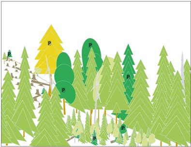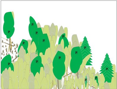 La méthode de l’arbre de place décrite ici est en partie fondée sur les travaux d’Ammann (2005) et est applicable moyennant adaptation dans les forêts protectrices dominées par les feuillus à basse altitude. En principe, vu la fonction prioritaire de protection, l’objectif consiste aussi à créer une structure irrégulière (par groupes), mais les collectifs n’ont plus la même importance que dans les forêts résineuses de montagne. La structure est engendrée par les arbres individuels ou, le cas échéant, par de petits collectifs (2 à 6 arbres). Pour garantir la stabilité du peuplement durant le long processus de conversion en structures étagées, il faut disposer d’un réseau d’éléments stabilisateurs en plus du mélange adéquat et de la stabilité collective. A l’instar de Schütz (1997), nous admettons que pour réussir une conversion en prenant des risques acceptables, il faut disposer, par hectare, d’au moins 40 éléments stabilisateurs à haute espérance de vie. Ces arbres joueront un rôle essentiel dans la formation de bordures stables dans les ouvertures de rajeunissement.