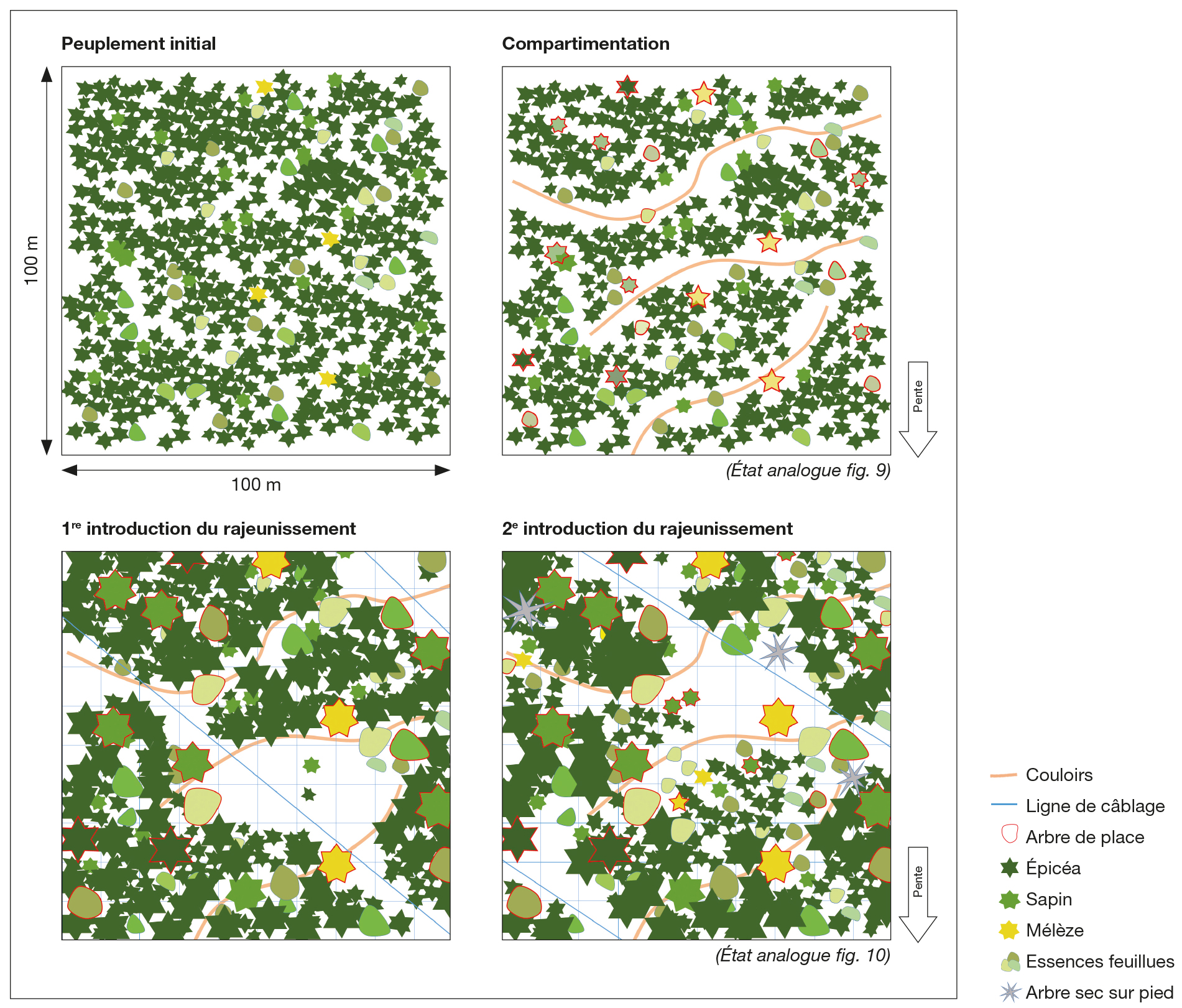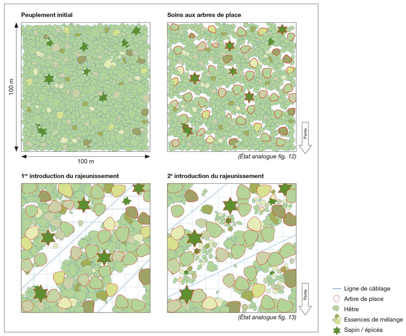 Fig. 13. Les soins aux arbres de place dans les jeunes peuplements fait émerger un réseau d‘éléments stabilisateurs en vue d’obtenir des arbres de bordures stables lors de la mise en place ultérieure des ouvertures de rajeunissement. Ces soins favorisent en outre les arbres importants pour le mélange.