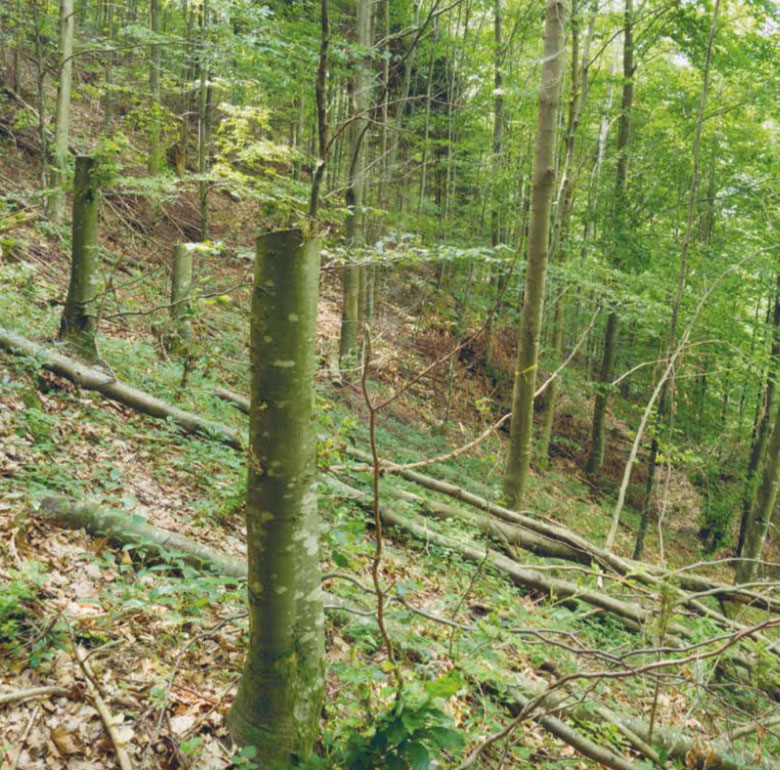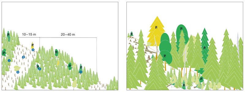 Si le nombre d’éléments stabilisateurs et d’essences de mélange est d’ores et déjà suffisant, et s’ils se développement conformément aux attentes, des interventions ne sont pas nécessaires, ou alors seulement ponctuellement. Si nécessaire, jusqu’à 60 arbres de place peuvent être requis et devraient alors permettre d’atteindre les objectifs fixés. Cela correspond à des écartements horizontaux moyens de 15 m ou davantage, sachant que les arbres de place sont répartis irrégulièrement. Leur écartement doit notamment être suffisant dans la ligne de pente, afin que des interventions répétées soient possibles sans devoir éliminer tous les arbres de soutien en amont, sous l’arbre de place voisin.