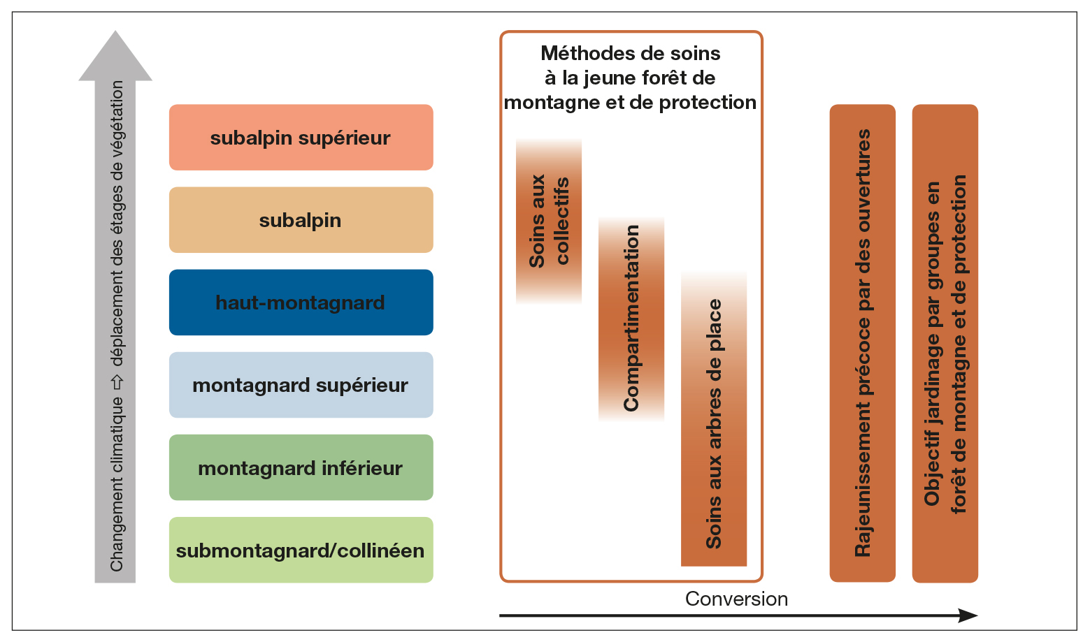 Les forêts des divers étages altitudinaux se distinguent par leur composition en essences, par l’importance des facteurs stationnels déterminants et par leur dynamique naturelle. Ceci influence autant l’objectif sylvicole que le traitement des jeunes forêts. Sous l’effet du changement climatique, les étages de végétation se décaleront vers le haut car les conditions stationnelles deviendront celles que l’on trouve aujourd’hui aux étages inférieurs.