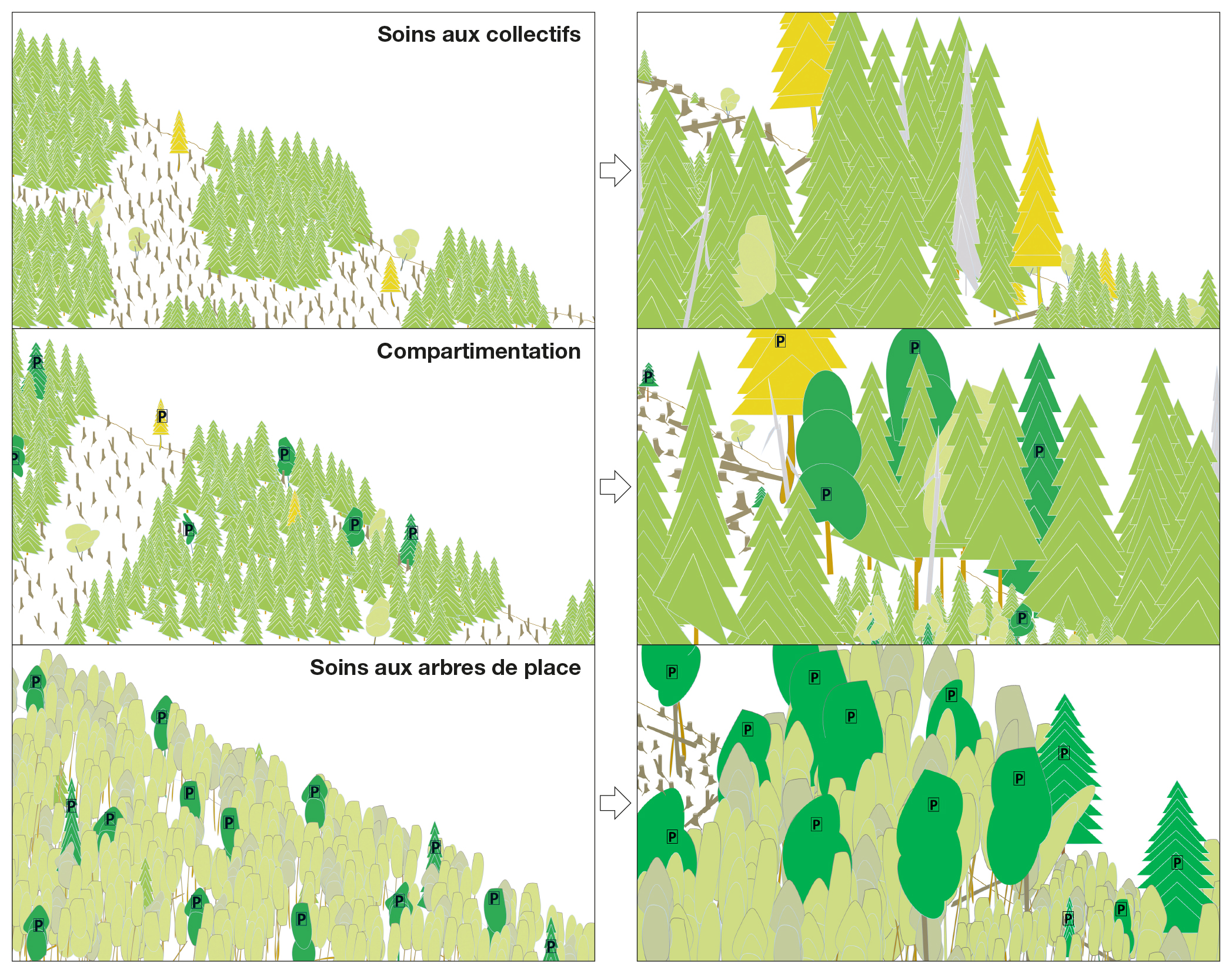 Parmi les trois méthodes – soins aux collectifs, compartimentation et soins aux arbres de place - il s’agit d’en choisir une en fonction de l’altitude et de l’état initial du peuplement.