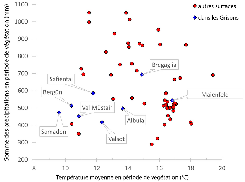 Les services forestiers cantonaux, les entreprises forestières, les pépinières et les chercheurs du WSL ont créé en Suisse, entre l’automne 2020 et le printemps 2023, un réseau de 57 placettes expérimentales d’essences d’avenir. Plus de 55 000 petits arbres (18 essences chacune de sept provenances différentes, réparties dans toutes les régions biogéographiques et à toutes les altitudes) seront observés pendant plusieurs décennies et fourniront des informations sur l’aptitude des essences à résister aux changements climatiques. Le réseau de plantations expérimentales – actuellement le plus vaste essai de plantation en Europe – est une infrastructure unique pour la recherche et la pratique, ouverte à d’autres idées et projets. Les placettes expérimentales couvrent ainsi un très grand gradient de conditions climatiques (chaud-sec, chaud-humide, froid-sec) et de propriétés du sol (Fig. 3, détails dans la publication originale en allemand).