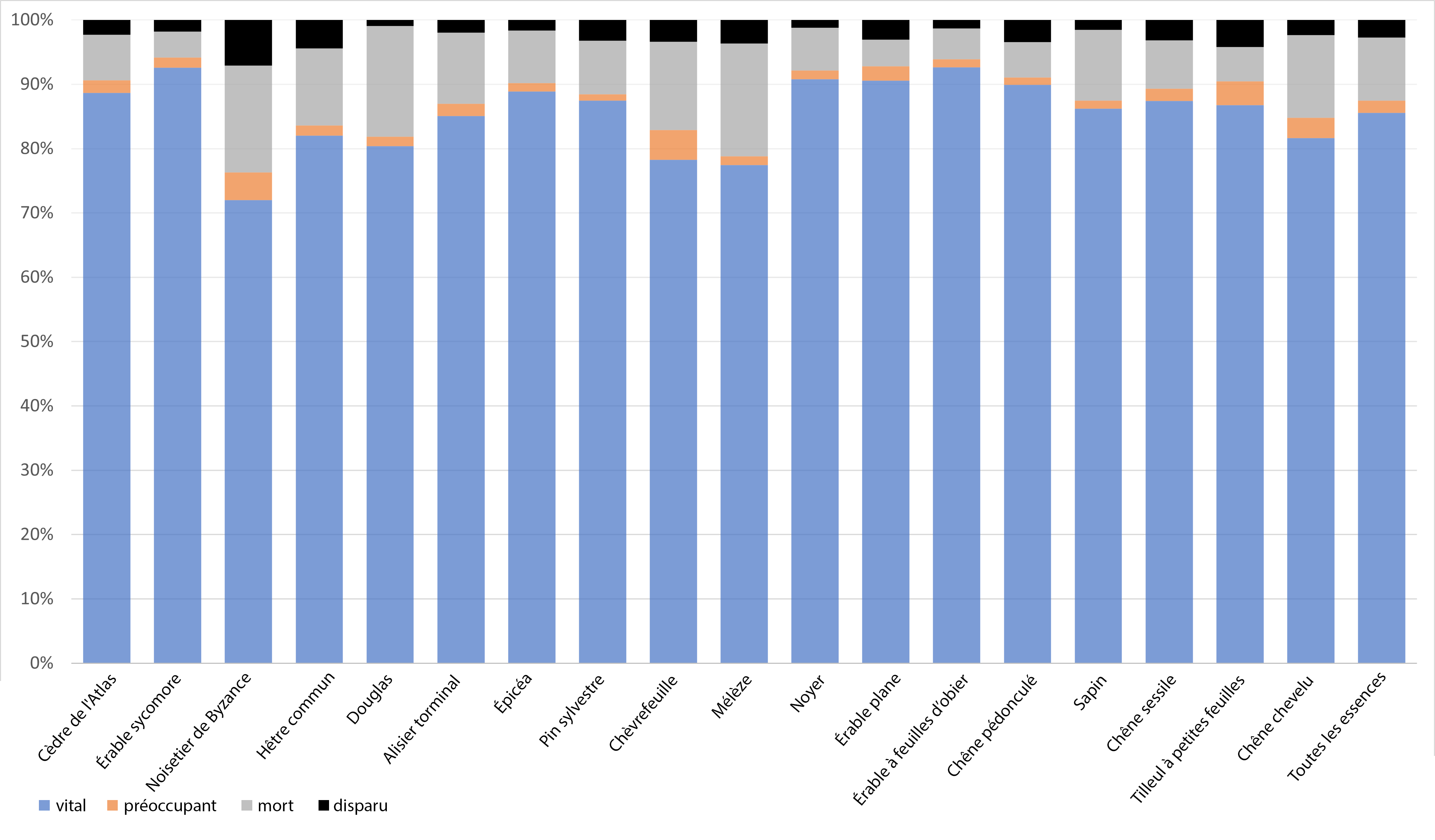 - Dommages à la cime (la plupart du temps de cause inconnue) chez 7% des plantes; cerisier et noisetier 16% chacun, pin 3%.