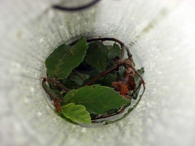 Fig. 4. Vue d’en haut dans le tube: Pour le hêtre, des tubes trop étroits font souvent que, lors de la poussée de croissance du début de l’été, la pousse terminale d’abord molle et pendante ne parvient pas à se redresser complètement et se lignifie dans cette position.