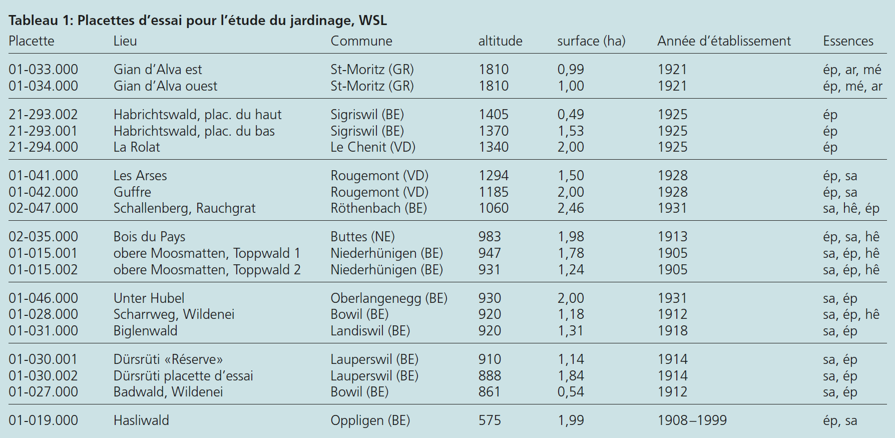 Un bon siècle plus tard, le terme de "forêt permanente" (Dauerwald) provoque aujourd'hui une nouvelle vague en Suisse. Dans l'intervalle, la recherche en matière de production et de croissance forestières a installé des placettes d'essai qui livrent aujourd'hui des données très utiles pour comprendre le fonctionnement des forêts jardinées. Des résultats scientifiques étayent ainsi les observations de terrain et l'expérience d'innombrables praticiens. De 1905 à 1931, le WSL (alors encore "Station centrale d'essais forestiers") a installé 23 placettes, dont 17 sont encore opérationnelles (Tableau 1).