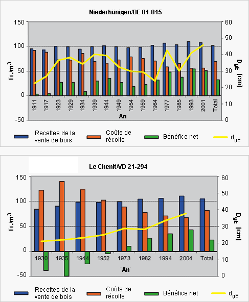 Sur les bonnes stations, en moyenne 60% des tiges récoltées sont des gros bois (arbres d'un DHP supérieur à 52 cm). Sur les stations d'altitude médiocres, ce chiffre tombe à 12%. Nous avons évalué de manière réaliste les coûts de récolte, les recettes de vente des bois et donc le bénéfice net (Fig. 7, Zingg et al. 2009).