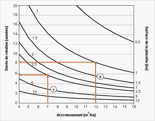 Fig. 6 - Calcul de la durée de rotation pour un volume de bois récolté de 100 m3, en fonction de l'accroissement et de la surface de la placette. Exemple 1: Pour un accroissement de 7 m3 par hectare et par un et une surface de 2,5 ha, on peut récolter 100 m3 tous les six ans de manière durable. Exemple 2: Pour un accroissement de 12 m3 par hectare et par un et une surface de 1 ha, on peut récolter 100 m3 tous les huit ans de manière durable.