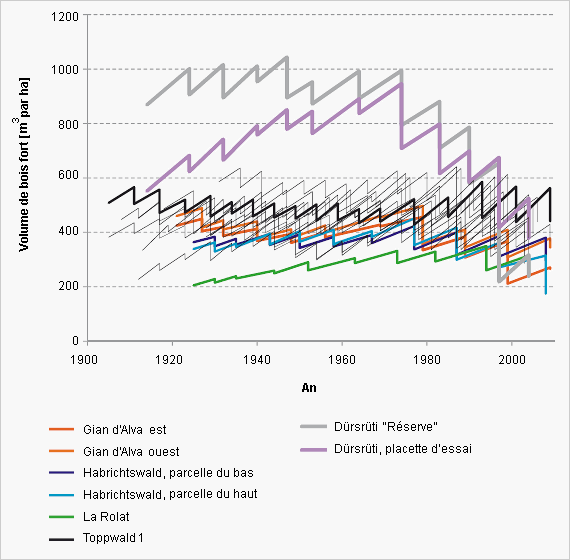 Sur les sites d'altitude de Gian d’Alva (St. Moritz, trait rouge) et de Habrichtswald (Sigriswil, trait bleu), le volume a diminué au cours des années.Cette évolution était voulue car aucune régénération ne s’était installée jusqu'en 1980 sur les placettes à fort volume. Sur les deux placettes de Dürsrüti, on essaya de jardiner avec de très forts volumes, ce qui a entraîné la perte à la fois de la structure et de la régénération. Sur les meilleures stations, c'est-à-dire les plus fertiles, on peut s'attendre à des volumes de 400 à 500 m3 par hectare, pour 200 à 300 m3 par hectare sur les stations d'altitude moins fertiles.