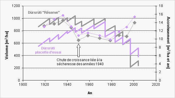 Sur la placette "Réserve" de Dürsrüti, le volume était de 900 m3 par hectare au début de l'expérience en 1914; sur la placette d'essai du même site, le volume a augmenté pour atteindre en 1970 le même niveau que sur la placette "Réserve", avant de diminuer légèrement. Après 1974, le volume a fortement baissé sur les deux placettes. En 2004, il n'affichait plus que 240 m3 par hectare sur la placette "Réserve" et 380 m3 par hectare sur la placette d'essai. Durant la même période, l'accroissement est remonté à 14 respectivement 15 m3 par hectare et par an, c'est-à-dire environ les mêmes valeurs qu'au début de l'expérience en 1914. A l'heure actuelle, il se situe à 17 respectivement 19 m3 par hectare et par an.
