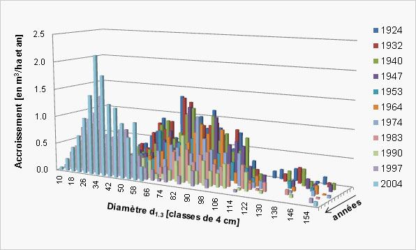 Le tableau serait toutefois différent si l'on représentait ces accroissements en terme de rendement, car ils sont surtout dûs à des jeunes tiges minces en pleine croissance. La figure 5 le montre clairement: alors qu'autrefois l'accroissement par hectare et par an était réparti sur tous les diamètres, il est depuis plusieurs années réalisé surtout par les arbres de faible diamètre et donc économiquement moins intéressants. Sur cette placette, l'équilibre et le rendement durable qui en découle ont été perdus, et on peut se demander combien de temps il faudra pour les restaurer.