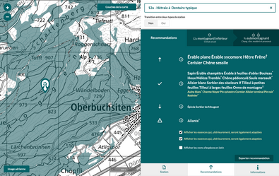 Les praticiennes et praticiens forestiers sont habitués à planifier à long terme, mais le besoin d’outils d’aide à la décision est croissant. L’application TreeApp a été développée pour rendre l’approche des «stations analogues» simple et rapide à utiliser pour ces spécialistes. Il suffit d’une position sur la carte et de la connaissance du type de station précédent. En l’absence de cartographie, TreeApp offre une aide complète pour déterminer le type de station. L’application détermine alors les «stations analogues» correspondantes et en déduit les recommandations en matière d’essences. Les deux scénarios climatiques utilisés, «changement climatique modéré» (RCP 4.5) et «changement climatique fort» (RCP 8.5), reflètent les incertitudes de la modélisation.