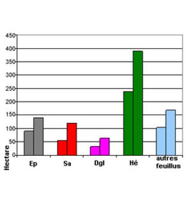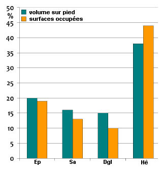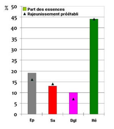 Fig. 7 - Réparation des essences dans le rajeunissement: le douglas est sous-représenté dans le rajeunissement préétabli (FE "Alt-Kandern", 2007).