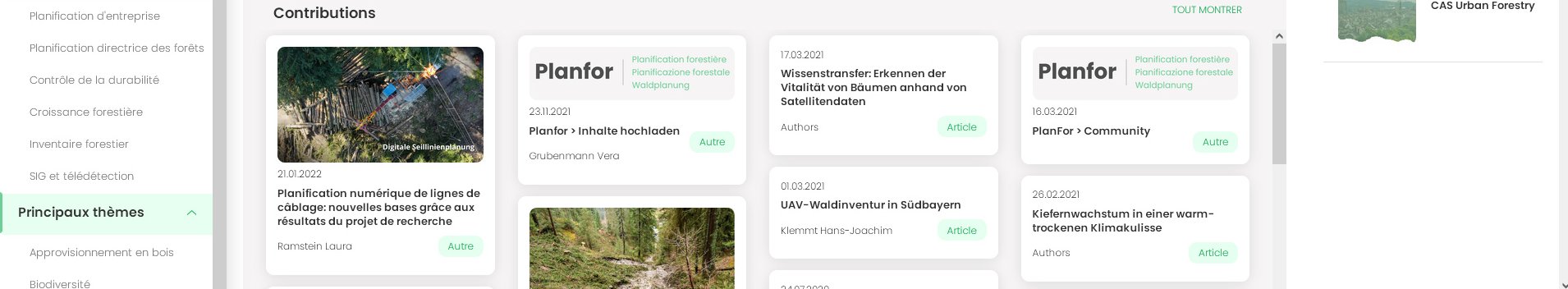 En plus de la banque de données, le site recense outils, spécialistes, bureaux et institutions qui disposent de connaissances spécifiques en planification forestière. Planfor propose également un agenda avec les prochaines manifestations consacrées à cette thématique et met à disposition la documentation et les résultats des conférences passées de sous forme de fichiers PDF. Le portail souhaite ainsi encourager l’échange d’expériences entre les spécialistes et fournir au grand public des informations utiles.