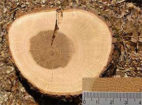 Fig. 2. Section d'un hêne pubescent de 12,5 cm de diamètre. On distingue clairement l’aubier très large. Cet arbre avait 118 ans.