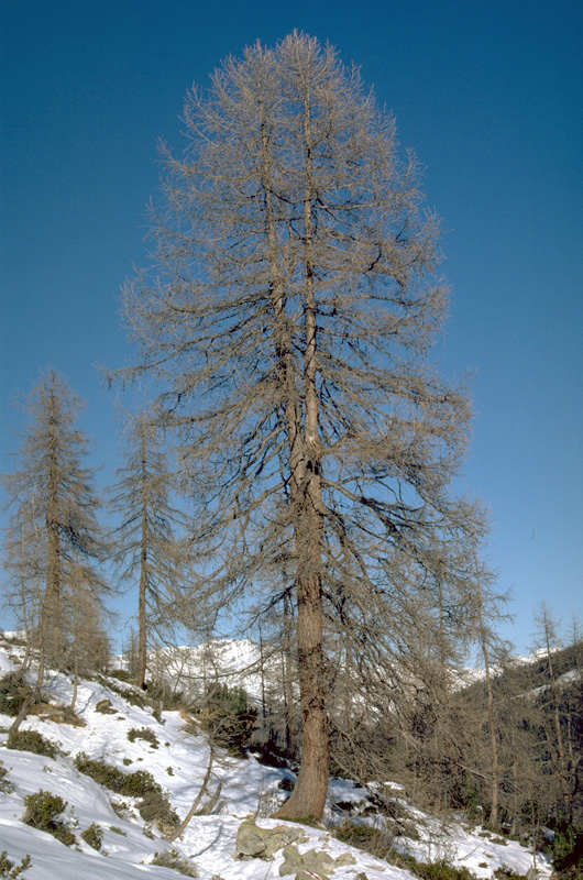 Comme la plupart des arbres, le mélèze vit en symbiose avec des champignons. Un exemple connu est le bolet élégant (Suillus grevillei), apprécié comme champignon comestible. Les graines grasses du mélèze sont une source de nourriture pour de nombreux oiseaux. Le mélèze a une signification spéciale dans le Jura et les vallées alpines; l’association des forêts et des pâturages, appelée pâturages boisés, permet au bétail de se nourrir d’herbes abondantes poussant sous les couronnes clairsemées des mélèzes (Fig. 5). Il n’y aurait par contre guère d’herbes sous les houppiers denses d’épicéas avec leurs aiguilles persistantes. Enfin, la chute annuelle des aiguilles de mélèzes en automne forme une couche d’humus très précieuse.