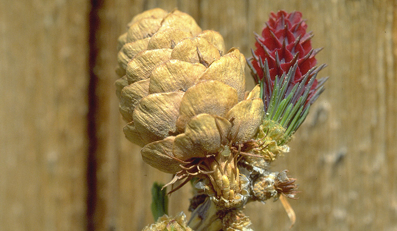 Fig. 4 - Rameau de mélèze avec cône et fleur femelle. Photo: Walter Schönenbeger