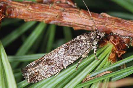 L’insecte probablement le plus connu lié au mélèze est la tordeuse du mélèze, un lépidoptère gris d’une taille d’à peine 2 cm. Ses chenilles, gris vert à brunes ou noires minent les aiguilles selon un cycle de 7 à 9 ans, provoquant une coloration brune de la couronne des arbres. Les aiguilles, qui semblent avoir été brûlées, tombent et des peuplements entiers de mélèzes sont ainsi dépouillés d’aiguilles dès l’été. Les arbres débourrent une seconde fois durant l’été mais restent néanmoins passablement clairsemés. La perte d’accroissement qui en découle se reflète dans la formation d’un cerne sensiblement plus étroit (plus de détails à ce sujet).
