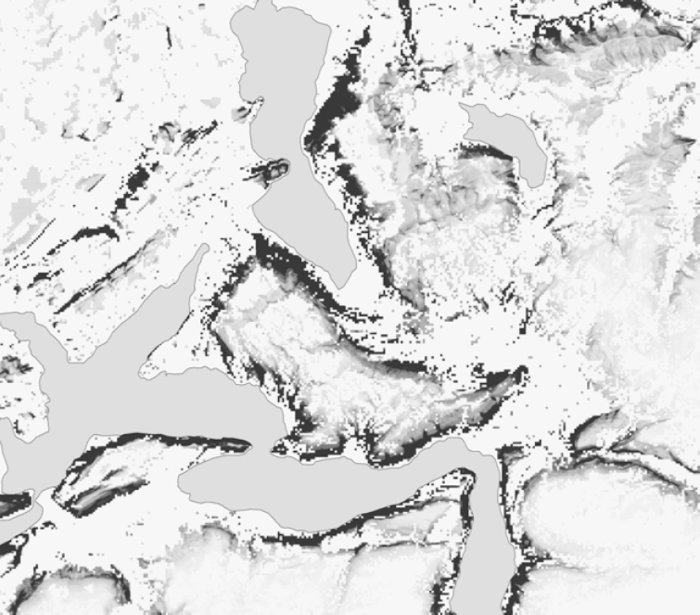 Fig. 8 - Présence modélisée de l’if dans la région du Rigi: Lac de Zoug (en haut) et Lac des Quatre-Cantons (en bas). Les zones sombres sont des forêts dans lesquelles la présence de l’if est très probable.