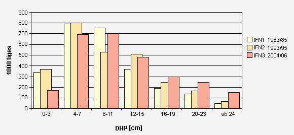Lorsque l’on considère l’ensemble des ifs d’au moins 0,1 cm de DHP, on s’aperçoit que leur nombre est resté pratiquement inchangé, puisqu’il n’a augmenté que de 2,6 à 2,7 millions au cours des 20 dernières années. En revanche, le transfert dans les plus gros diamètres est frappant (fig. 6) car on constate que le nombre de gros ifs a fortement augmenté. Environ 150 000 d’entre eux ont un DHP d’au moins 24 cm. Par contraste, le nombre d’ifs des classes de diamètre 0-3 cm (DHP 0,1 à 3,9 cm) a diminué. Avec 170 000 tiges (IFN3), cette classe est fortement sous-représentée. La population a donc seulement grossi (vieilli), tandis que le manque de rajeunissement a tendance à s’aggraver. La structure actuelle n’est pas durable à long terme.