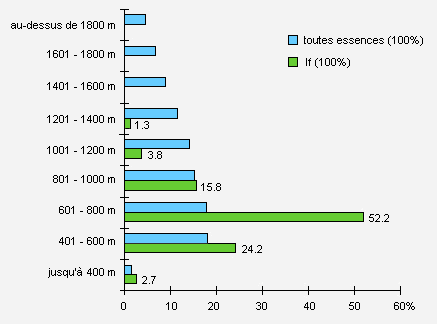 En raison de sa sensibilité au gel hivernal, l’if est presque uniquement limité aux étages collinéen et submontagnard (48%) et montagnard inférieur (44%), comme en attestent les données de l’IFN. Plus de la moitié des ifs poussent entre 600 et 800 mètres d’altitude (Fig. 4), avec une valeur médiane de 720 mètres, c’est-à-dire juste en-dessous de celle du hêtre. En Suisse, on rencontre l’if jusqu’à 1400 mètres. La plus haute placette IFN comportant des ifs est située dans le Pays de Glaris, à 1250 mètres. Dans 60% des cas, cette essence secondaire typique est présente dans des peuplements feuillus purs ou mélangés, où les trois essences dominantes les plus fréquentes sont le hêtre (34%), l’épicéa (18%) et le sapin (16%).