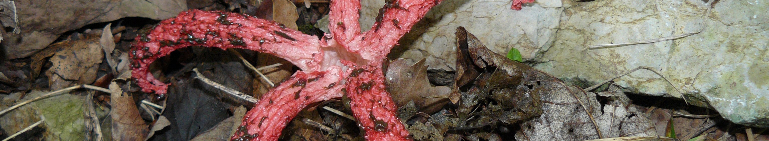L' Anthurus étoilé (Clathrus archeri): est une espèce très voyante et reconnaissable entre toutes dans nos contrées. Les fructifications sont dans un premier temps enfermées dans un oeuf blanc à brun pâle (de 3 à 5 cm de largeur), qui se développe initialement de façon souterraine. À msa base se trouvent d’épaisses et longues radicelles (appelées rhizomorphes). En coupe longitudinale, on remarque une couche gélatineuse sous l’enveloppe (ou péridie) de l’oeuf.